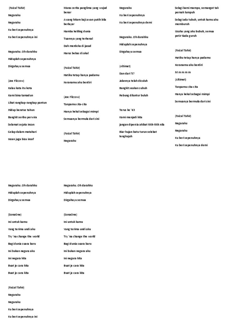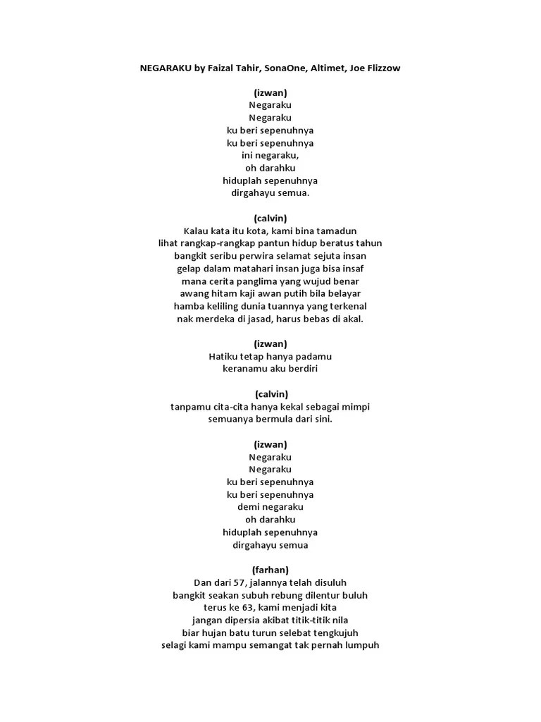 Faizal tahir · song · 2016. Negaraku joe flizzow, altimet, sona one & faizal tahir ( official lyric video); . Negaraku lirik faizal tahir marleyuti. Listen to negaraku on spotify. Lyrics translations of negaraku by faizal tahir joe flizzow altimet sonaone popnable. Negaraku / negaraku / ku beri sepenuhnya / ku beri sepenuhnya, ini negaraku / oh darahku / hiduplah sepenuhnya / dirgahayu semua / kalau .
